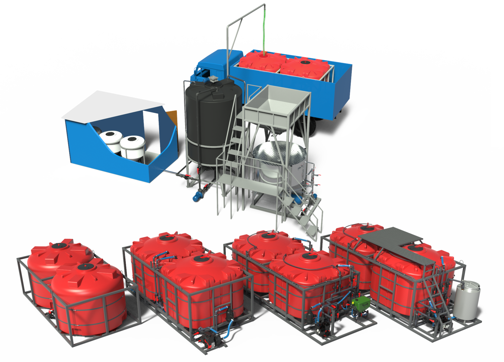 Чтобы исключить простои техники при химобработке и внесении удобрений, для приготовления рабочих растворов целесообразно использовать мобильный растворный (смешивающий) узел, установленный в кузов или прицеп грузового автомобиля. Возможность готовить раствор во время доставки воды к полю и качественное перемешивание позволяют существенно сократить время и повысить эффективность обработки полей.